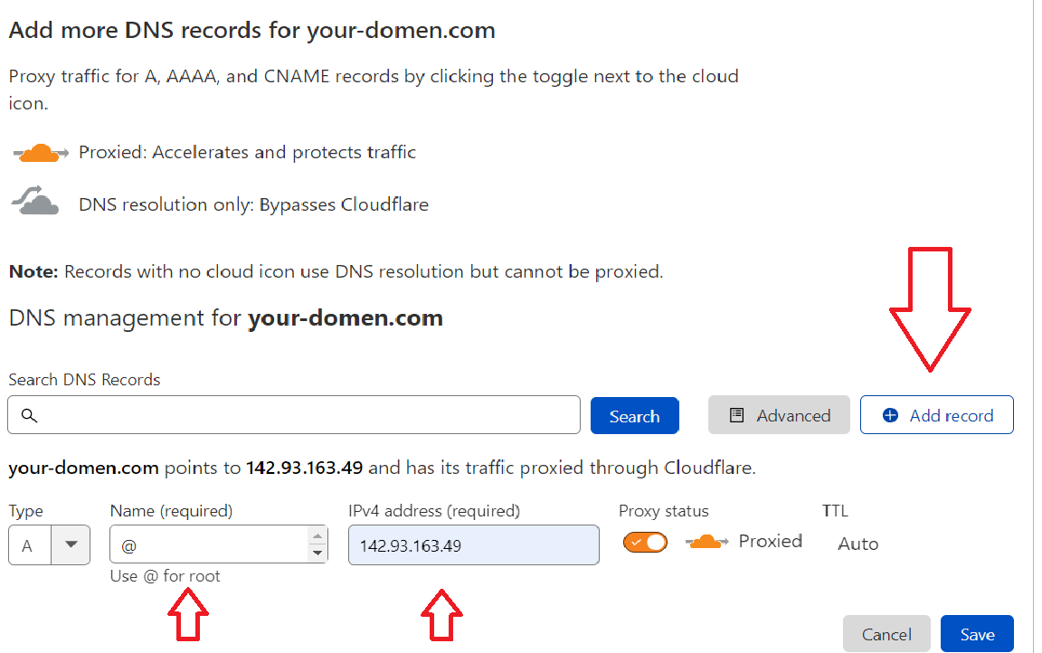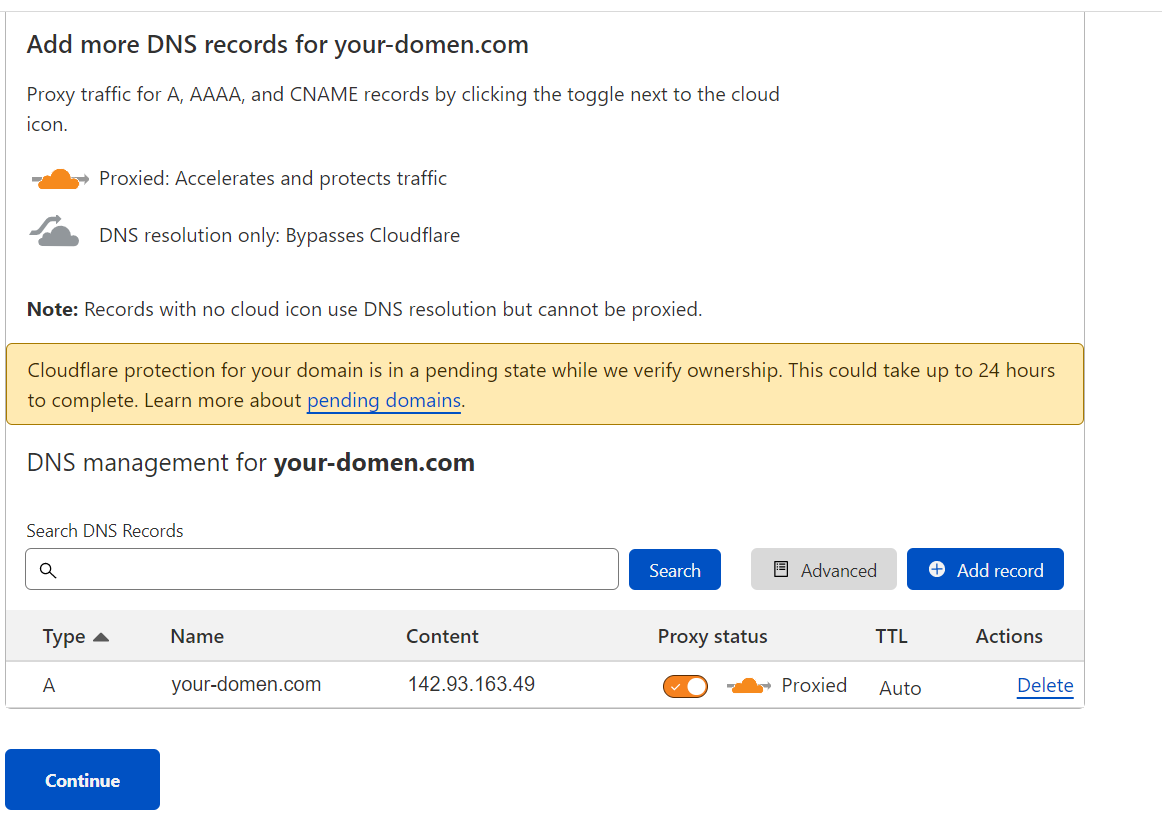 - Нажимаем Add record и добавляем одну A запись (name: @, ipv4adress: 142.93.163.49). И далее жмем сохранить и continue.