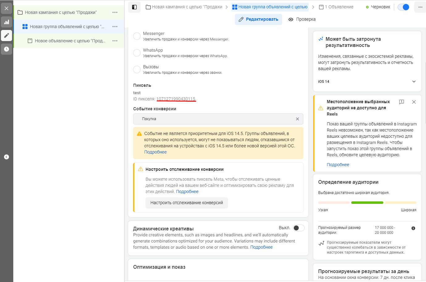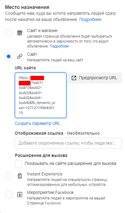 Заходим в кабинет Facebook Ads, открываем раздел «Настройки» объявления и добавляем в поле Website URL наш justlink с id пикселя.