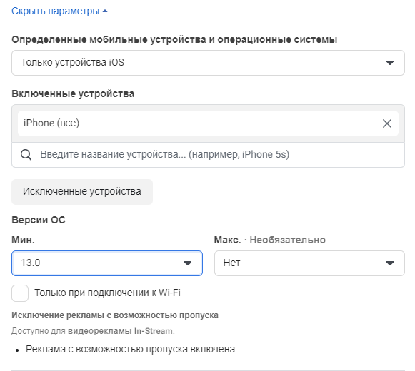 Далее переходим в группы объявлений, места размещений и настраиваем таргет на устройства как показано ниже