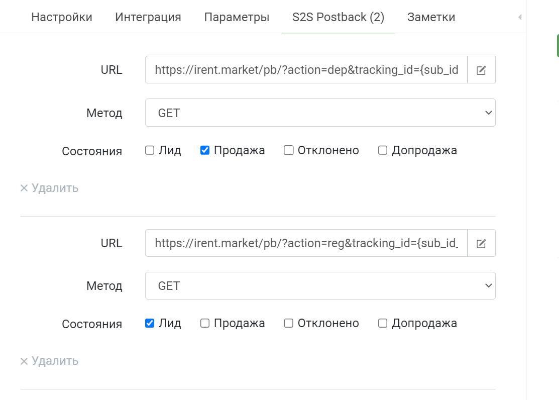 - Скопировать ссылки и вставить их в раздел Keitaro s2s с методом GET